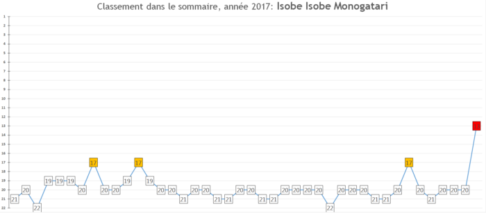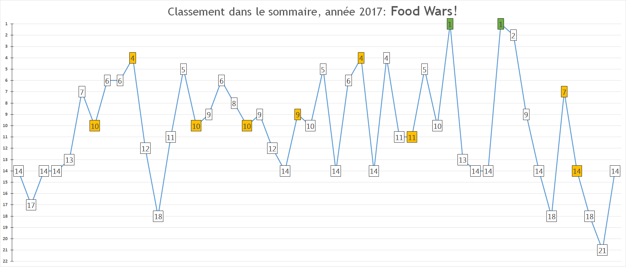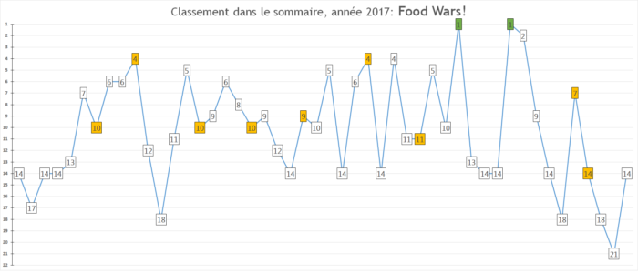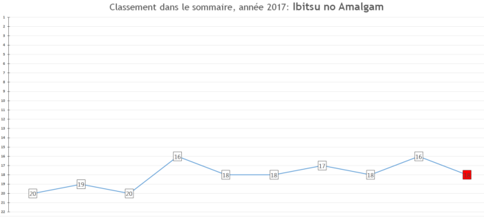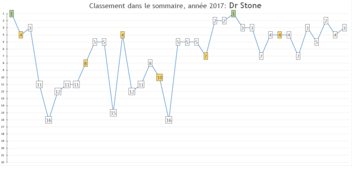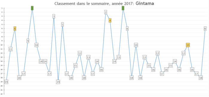 Rappel des prévisions 2016: « La série devrait devenir une habituée du top 5, se taper des très bons chiffres de ventes à chaque nouveau tome – ptet même déjà s’installer dans le top 30 annuel de l’Oricon allez soyons fous -et annoncer fin 2017 un animé pour 2018. »