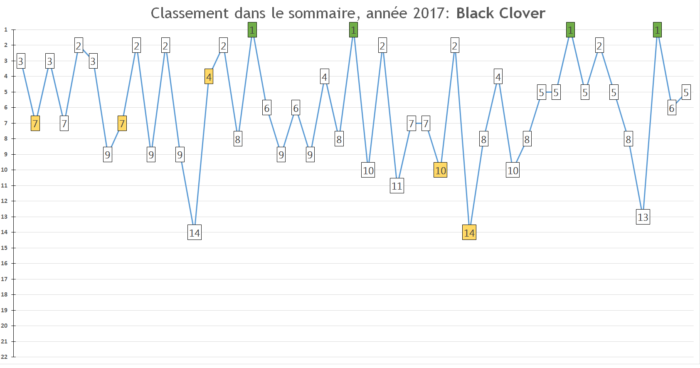 Mais ça c’est des news de fin d’année, qui arrivent au bon moment car jusque là l’année 2017 de Black Clover était honnête sans plus: dans le sommaire elle faisait le yoyo entre le très haut du sommaire et son milieu, les ventes progressaient ultra mollement et, comme pour My Hero Academia, l’auteur a du prendre une semaine d’absence pour des raisons de santé.