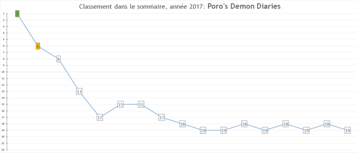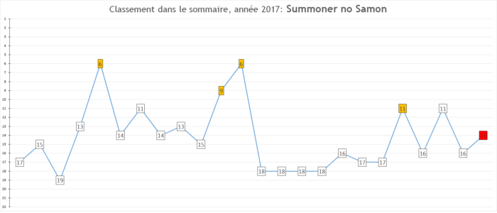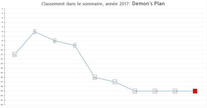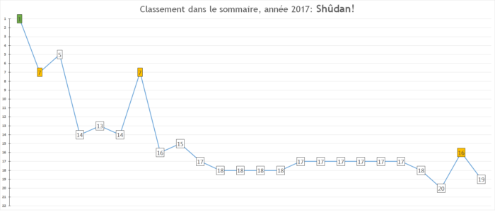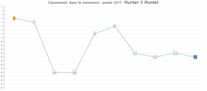 Prévisions pour 2018: La série peut encore progresser un poil dans les ventes au Japon et je vois bien la sortie du film d’animation contribuer à un nouveau boom. Je prie simplement que la santé de l’auteur ne s’aggrave pas :'(.