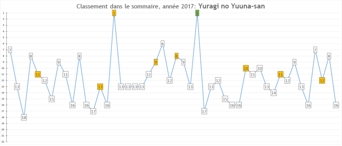 Comment la série se porte ? La vie de Yuragi no Yuuna-san fut très tranquille, et relativement conforme aux prédictions: si la série est devenue une habituée du ventre mou voire de la partie basse du sommaire, les ventes restent solides et suffisantes pour justifier pleinement sa présence dans le sommaire. D’un point de vue éditorial, la série n’a également pas particulièrement modifié son ADN: si quelques arcs un peu sérieux se sont installés le temps d’une poignée de chapitres, on reste dans une comédie friponne à l’ancienne, qui n’a pas peur de montrer du popotin et du tété par paquets entiers.